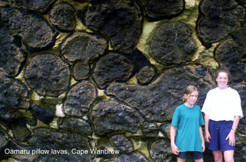Oamaru pillow lavas and volcaniclastic rocks. Map: J41; Classification: A3. Significance: One of the the best pillow lava flows in the world, within the best exposed sequence through the volcaniclastic deposits of Oamaru volcano.